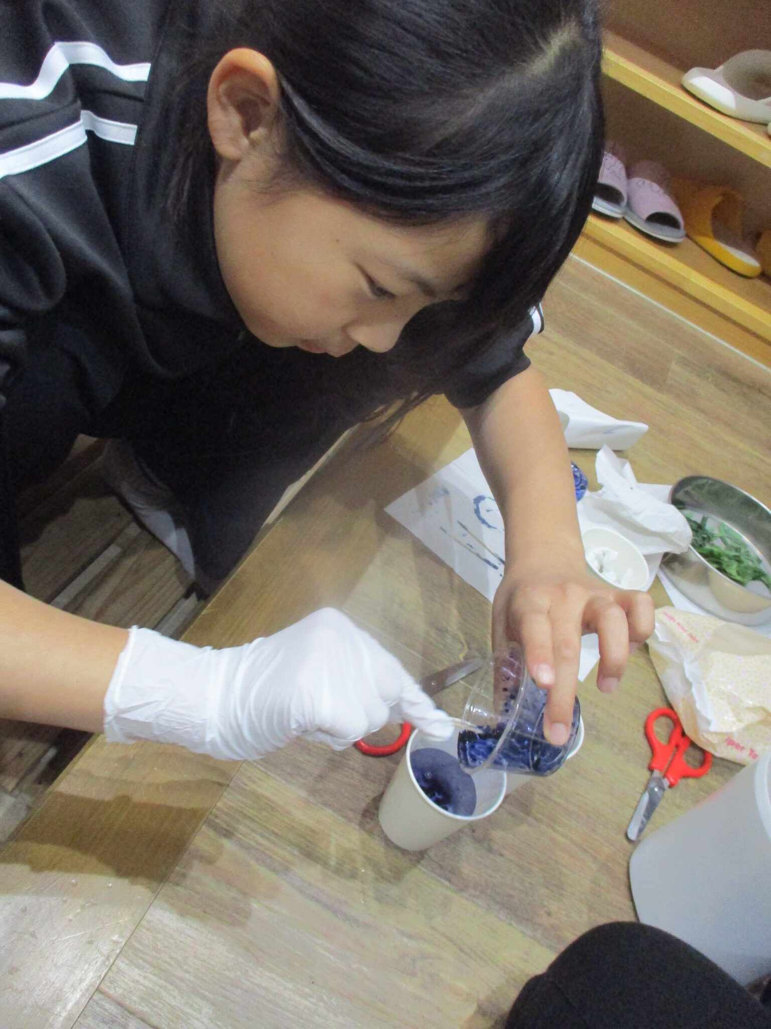 そとで採った木の実で色水を作りました!