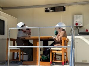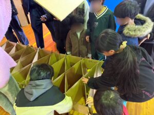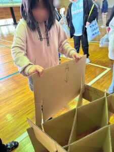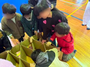 ダンボールをみんなで協力して組み立ててベット完成👏